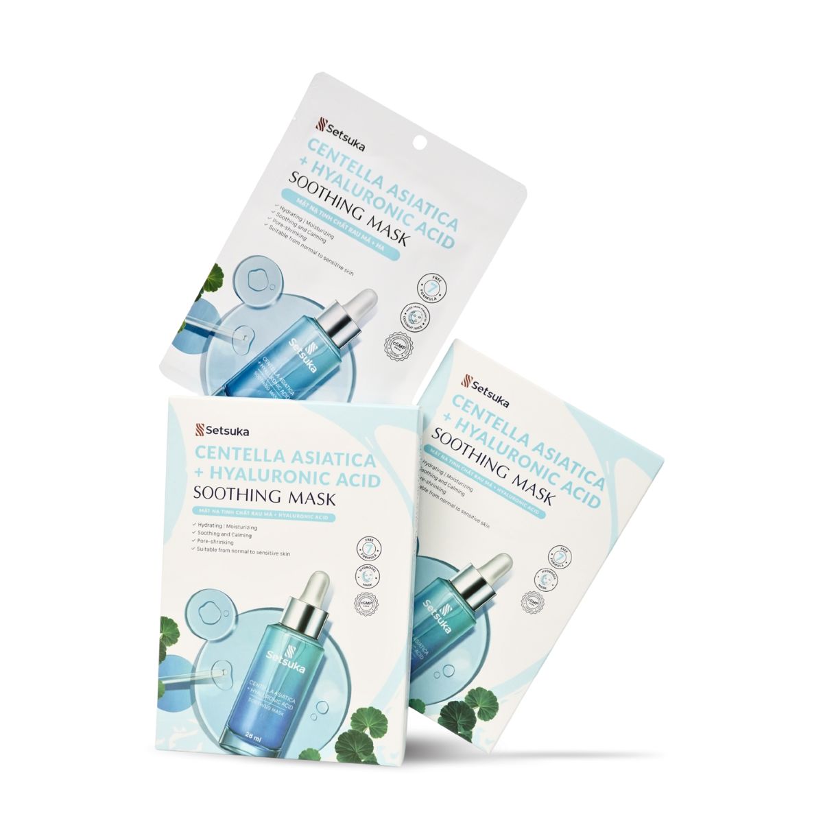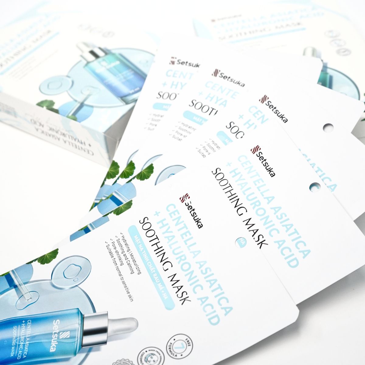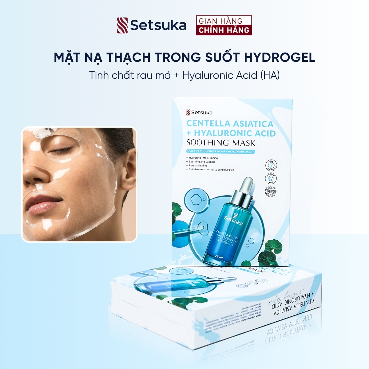 Mặt nạ thạch Hydrogel Tinh chất rau má & Hyaluronic Acid đến từ thương hiệu Setsuka – với chiết xuất rau má và hyaluronic acid 1.2 - 2.2 MDa giúp làm dịu da, dưỡng ẩm và cấp ẩm, se khít lỗ chân lông, làm da trông căng bóng, mềm mại và mịn màng. Kết hợp công nghệ Hydrogel cải tiến giúp ôm sát khuôn mặt.
